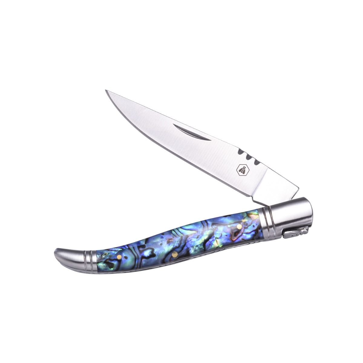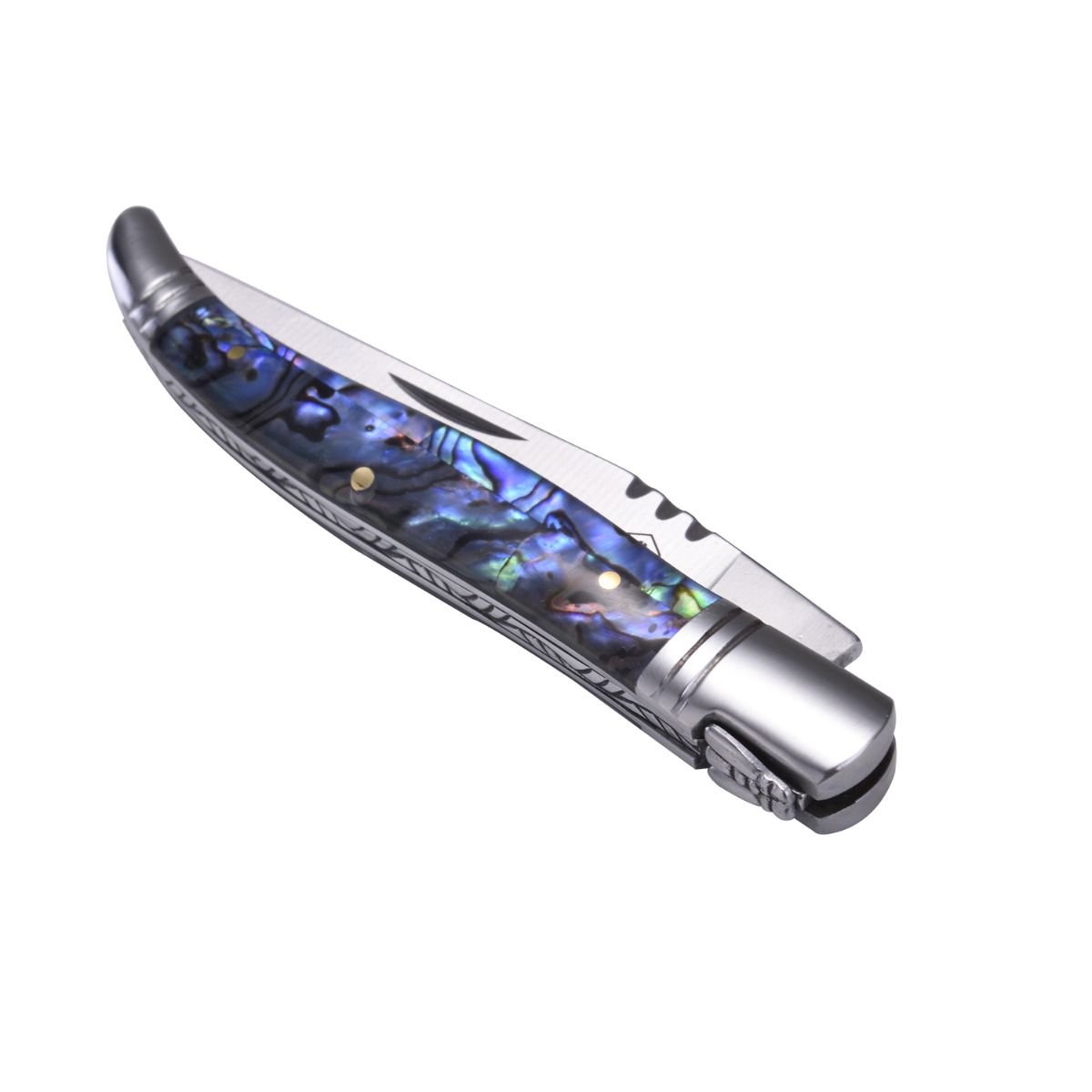 Сгъваем туристически нож Laguiole със седефени чирени. Ножът се предлага в подаръчна кутия, изработена от рециклирани материали.