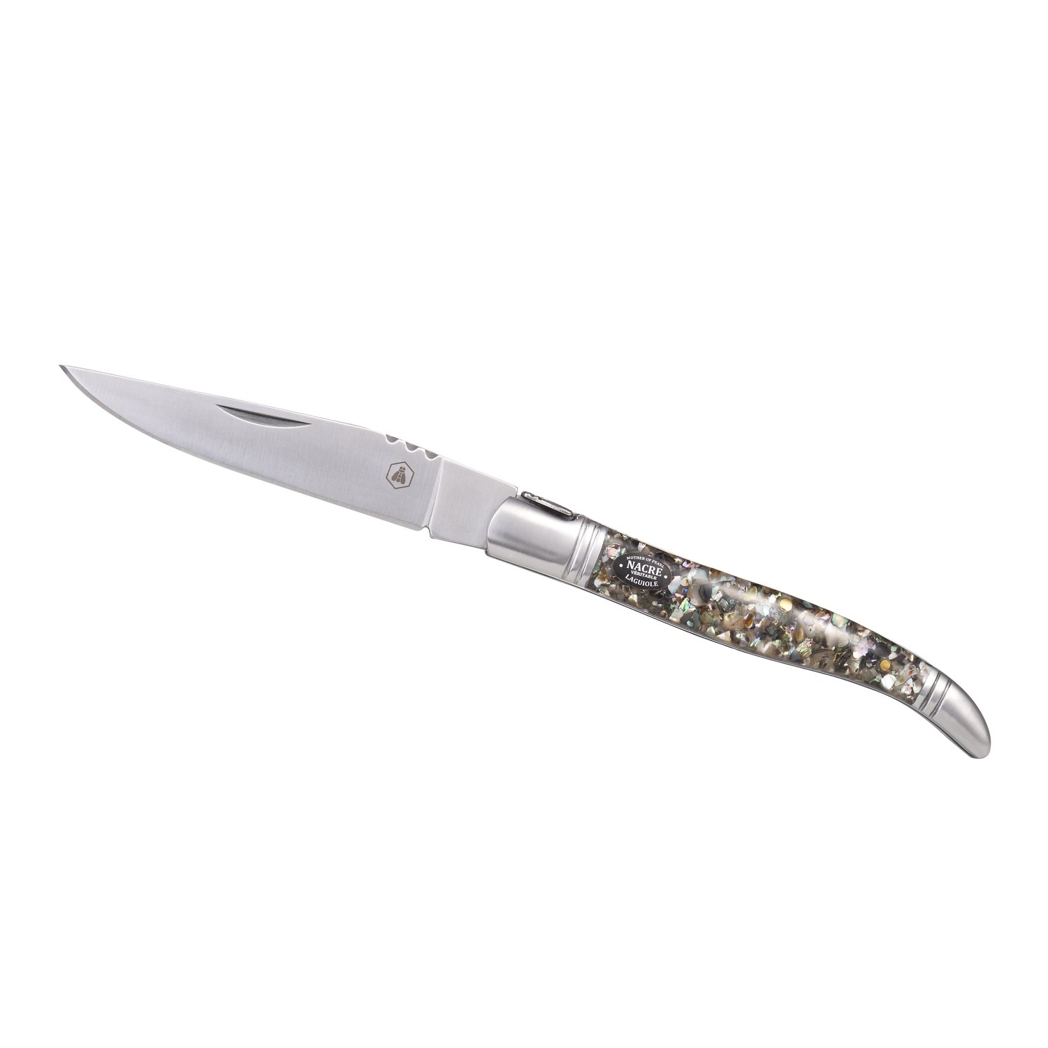 Сгъваем туристически нож Laguiole със седефени чирени. Ножът се предлага в подаръчна кутия, изработена от рециклирани материали.