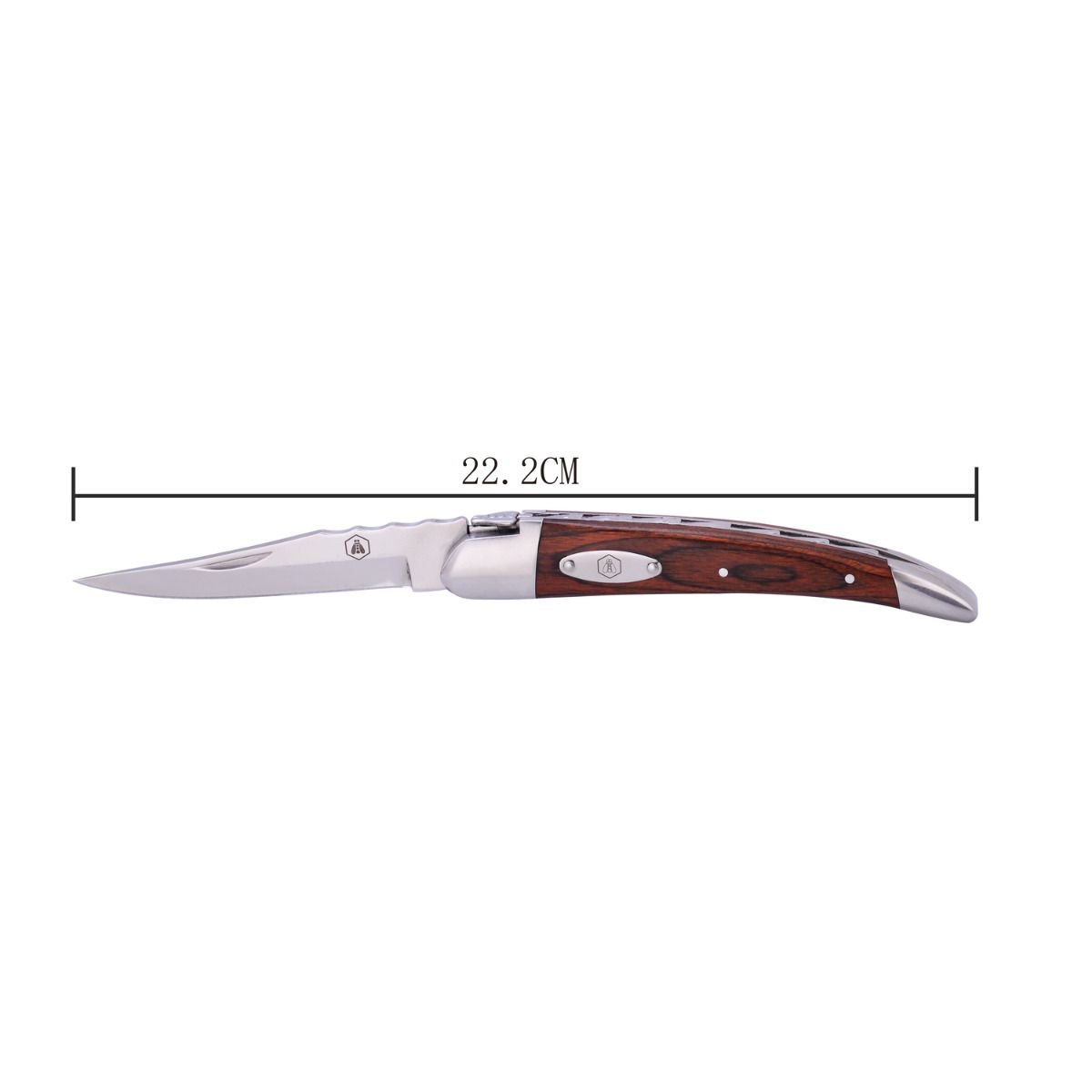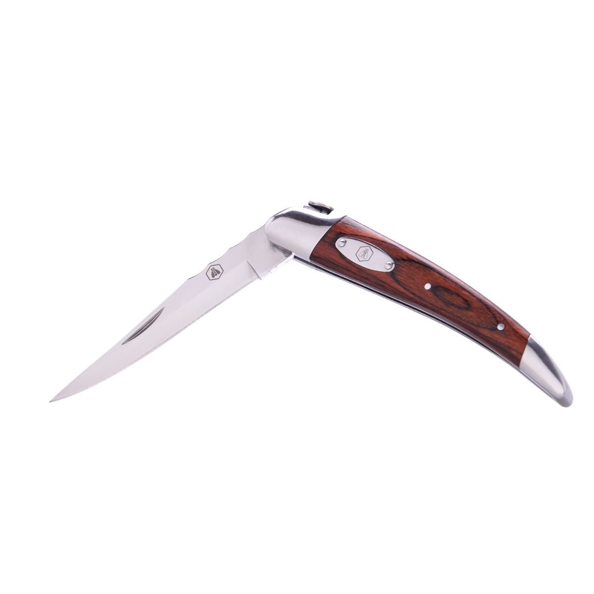 Сгъваем туристически нож Laguiole. Чирените на ножа са изработени от няколко слоя импрегнирани дървесни фурнири(Pakkawood). Към тях е вградена метална табелка с логото на Laguiole. Ножът се предлага в подаръчна кутия, изработена от рециклирани материали.