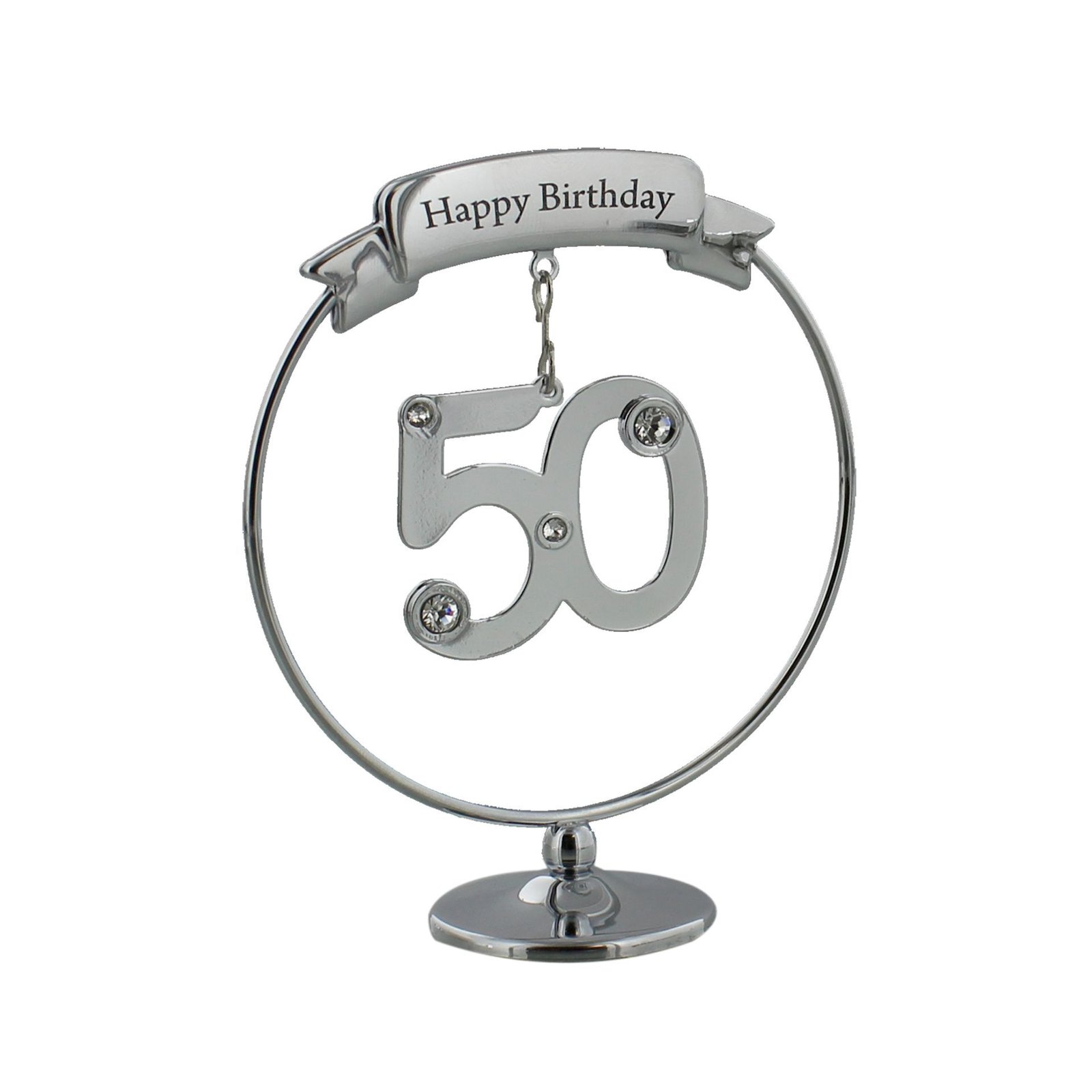 Красив ностолен сувенир с надпис „Честит рожден ден“ за 50 годишнина. Декоративната цифра е окачена на изрязана кръгла рамка и е украсена със световноизвестни австрийски кристални елементи.