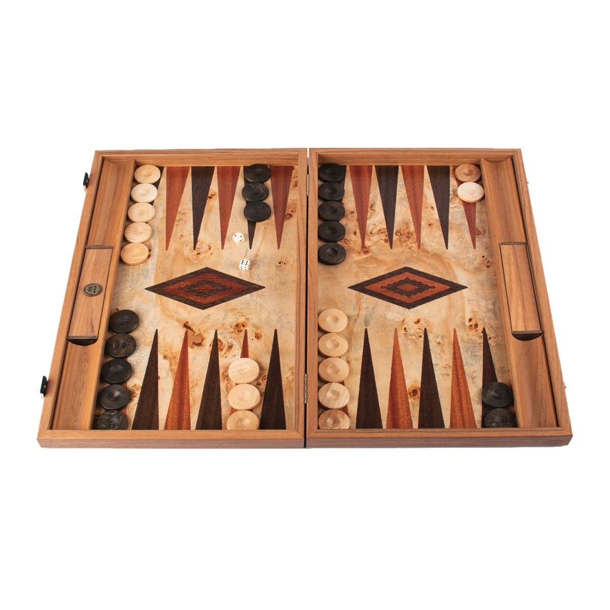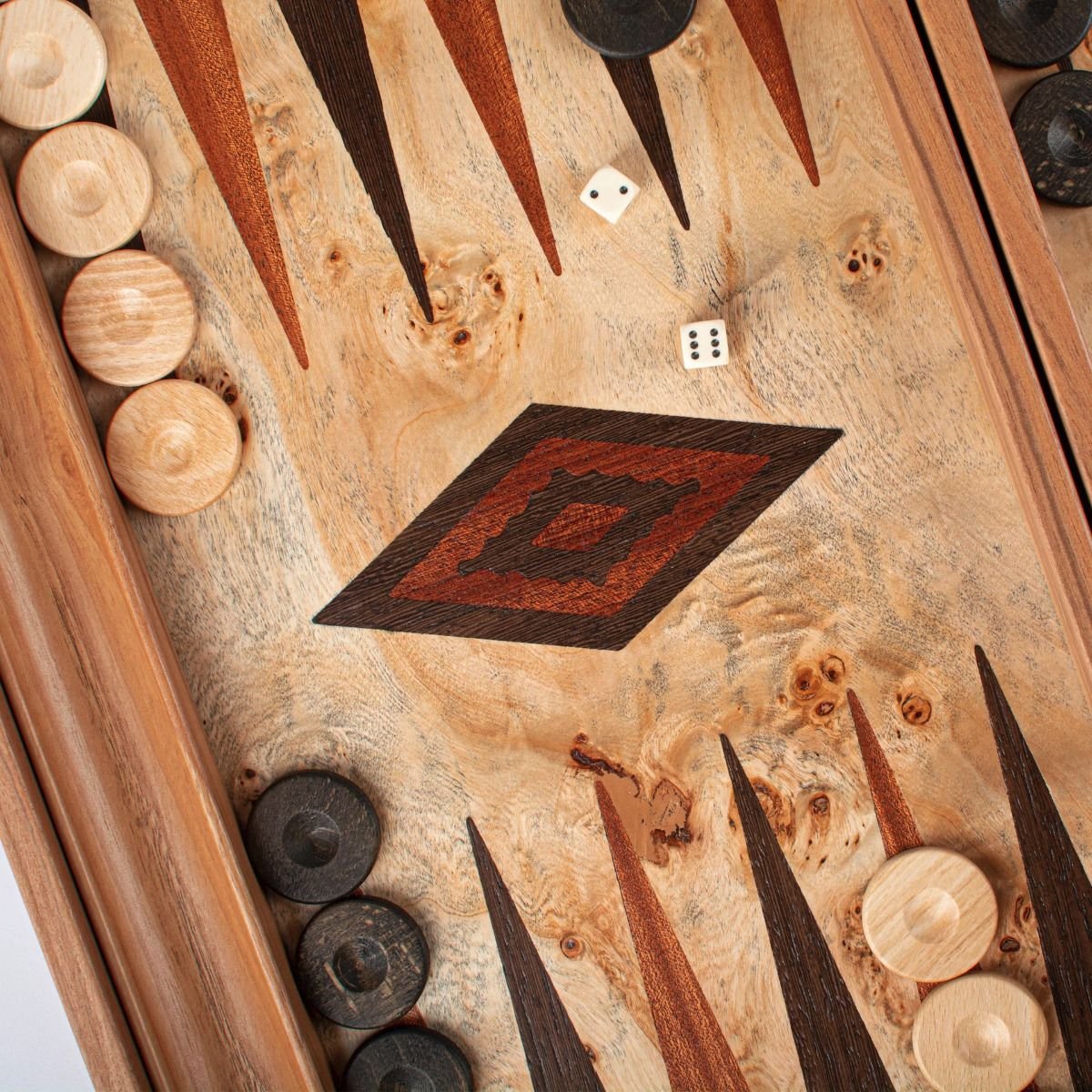 Ръчно изработена табла с естествен дървесен фурнир Lupo и инкрустирани капии от венге и махагонов фурнир. Фурнирът от lupo burl е много уникален и всяка табла никога не е същата с друга.