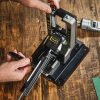 Work Sharp Professional Precision Adjust Knife Sharpener е новият еталон за ръчно заточване на ножове. Благодарение на преработените възможности за настройка необходимият ъгъл на заточване може да се зададе между 15° и 35° за нула време, а допълнителният цифров нивелир с точност до 0,25° осигурява прецизни и възпроизводими резултати. За тялото на дръжката се предлага пълен набор от сменяеми шлифовъчни плочи: Диамантени плочи с песъчинки 220, 320, 400, 600 и 800, както и финозърнеста керамична плоча за поправка, заточване и хонинговане. Коженият каиш усъвършенства и полира острието за постигане на оптимални резултати, а друга керамична плочка е специално проектирана за заточване на назъбени остриета. В сравнение с точилото Precision Adjust, много по-голямото точило за ножове Professional Adjust е оборудвано с масивно метално тяло и отвори за завинтване на работна маса, което ви позволява да заточвате дори пълноразмерни ножове или мачете. Това означава: безопасна стойка, безопасно заточване и определено остри ножове! Иновативната скоба V-Block фиксира ножа бързо и надеждно за сигурно захващане без изплъзване. Практичната приставка за маса позволява заточване на малки джобни ножове и тесни остриета под ъгъл до 10°.