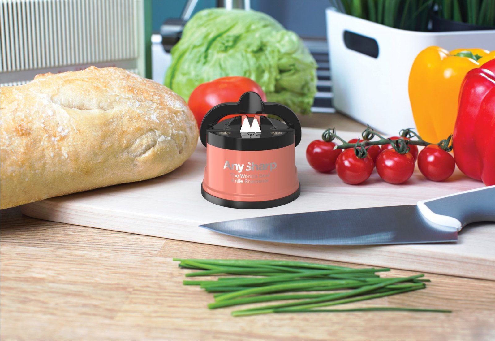 AnySharp е с патентована мощна система за закрепване и безопасна работа. Мощният вакуум осигурява сигурно закрепване към всякаква гладка повърхност, като по този начин ръцете ви са на безопасно разстояние.