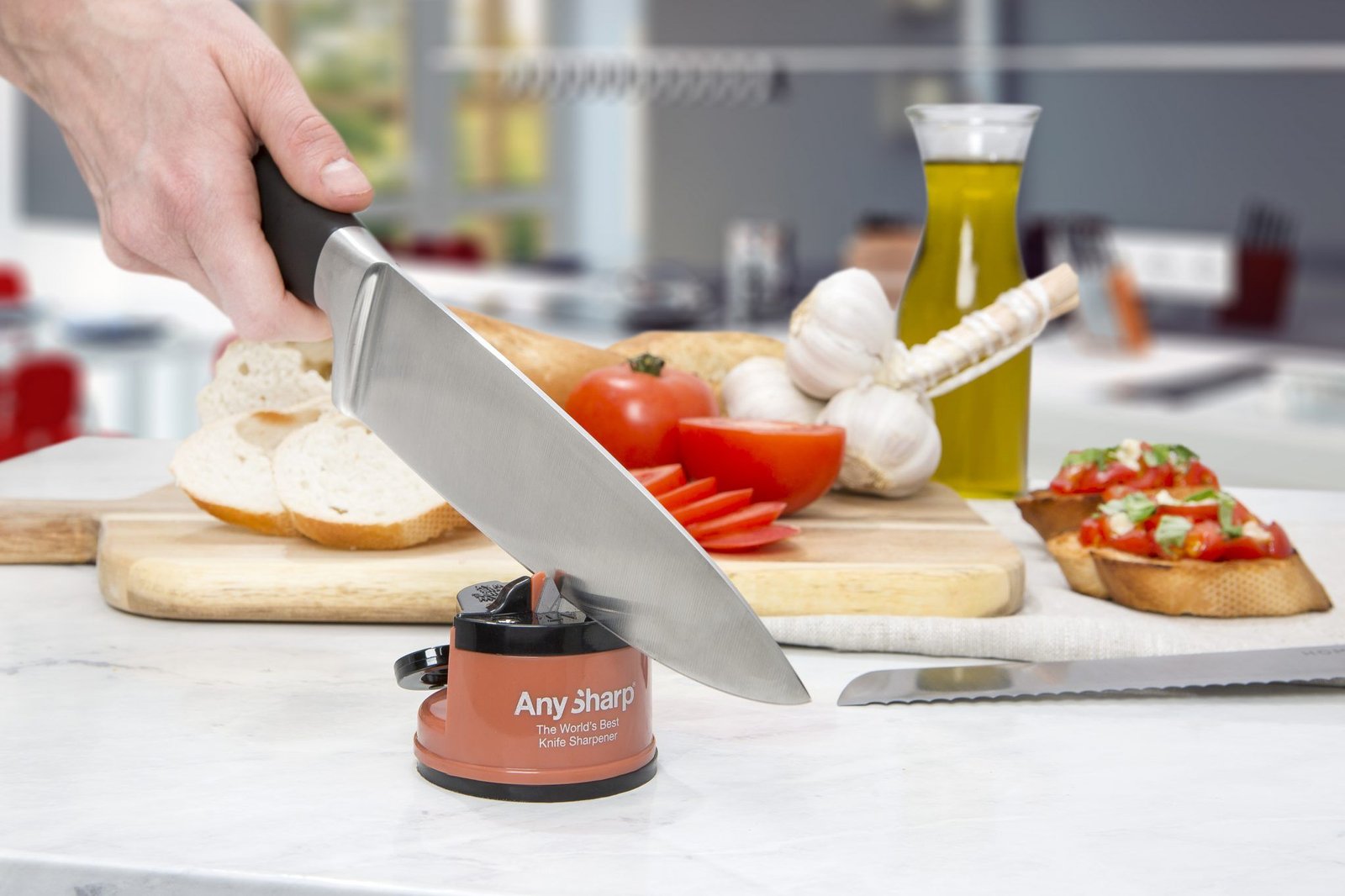 Точилото AnySharp възстановява ножовете безопасно и предпазва ръцете от нараняване. Само няколко леки плъзвания и ножът е като нов.