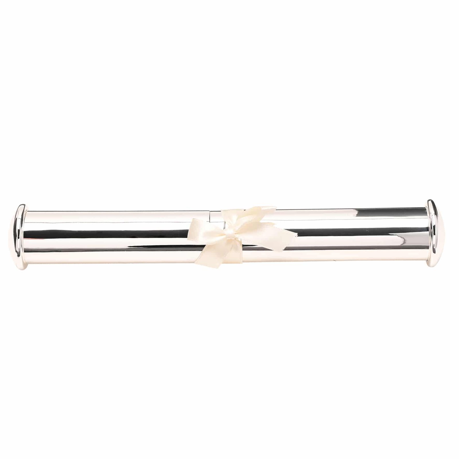 Посребрен тубус за брачно свидетелство AMORE BY JULIANA®. Тази елегантна поставка с форма на тръба се отваря от центъра чрез завъртане на двата края. Завършена със сатенена панделка в цвят слонова кост и луксозна фолирана подаръчна кутия с етикет.