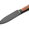 Дръжката на ножа е създадена от пресовани кожени пръстени, които са майсторски монтирани между предпазния елемент и крайната капачка, която е изработена от висококачествена неръждаема стомана. Тези допълнителни елементи не само подчертават красотата на ножа, но и осигуряват удобство и сигурност при употреба. Към ножа също така е приложена и елегантна кожена кания, която придава завършен вид на цялостния негов облик.