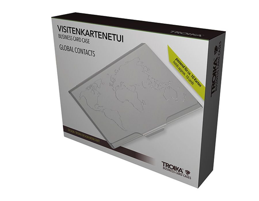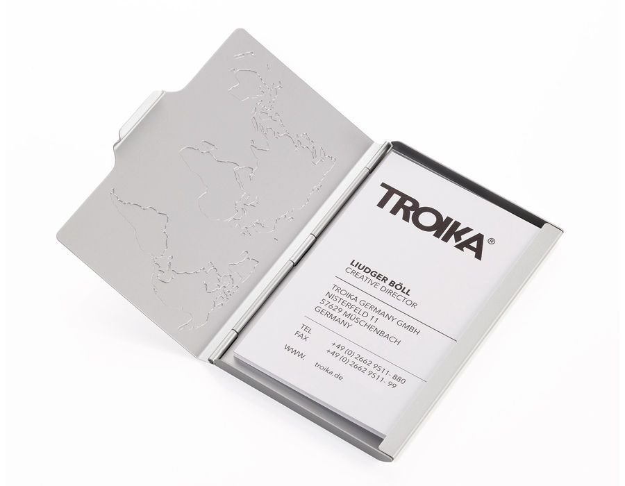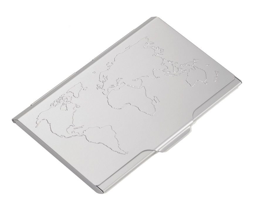 Визитник TROIKA алуминиев с релефна карта на света за 10 визитни картички.