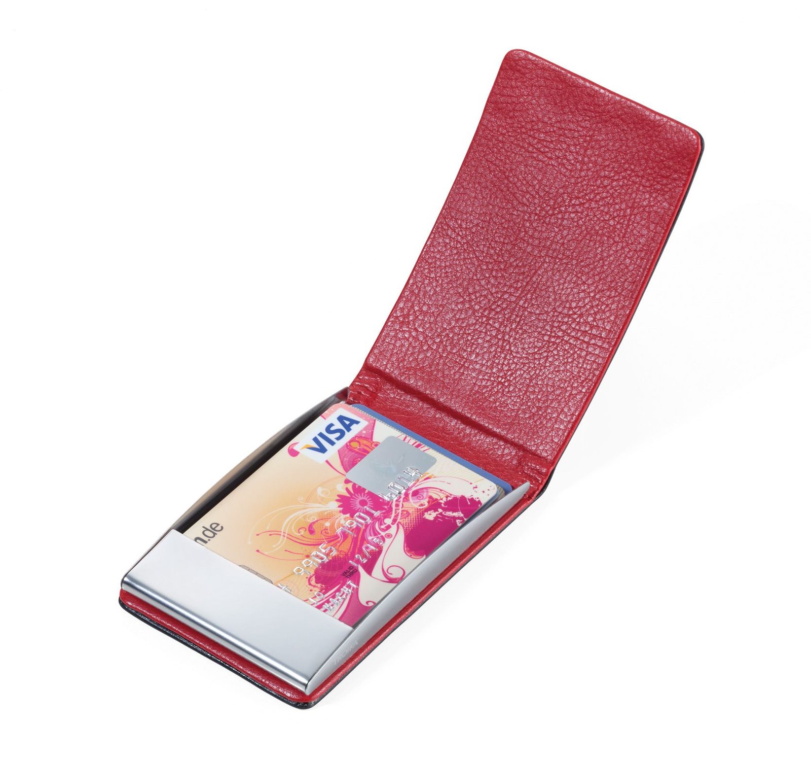 Метален визитник TROIKA, еко кожа, метал, магнитно закопчаване, червено-черен. RFID защита, ако решите освен визитки да съхранявате и кредитни карти. За около 19 визитки.